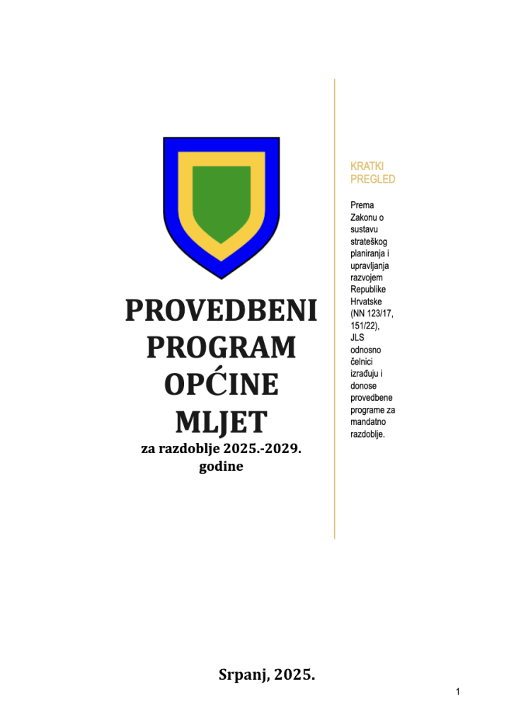U Provedbenom programu utvrđeni su strateški ciljevi i prioriteti, analizirani izazovi i razvojne potrebe Općine Mljet te razrađene aktivnosti, razvojni projekti i potrebni resursi u svrhu odgovora na prepoznate potrebe budućeg razvoja Općine na lokalnoj razini.
